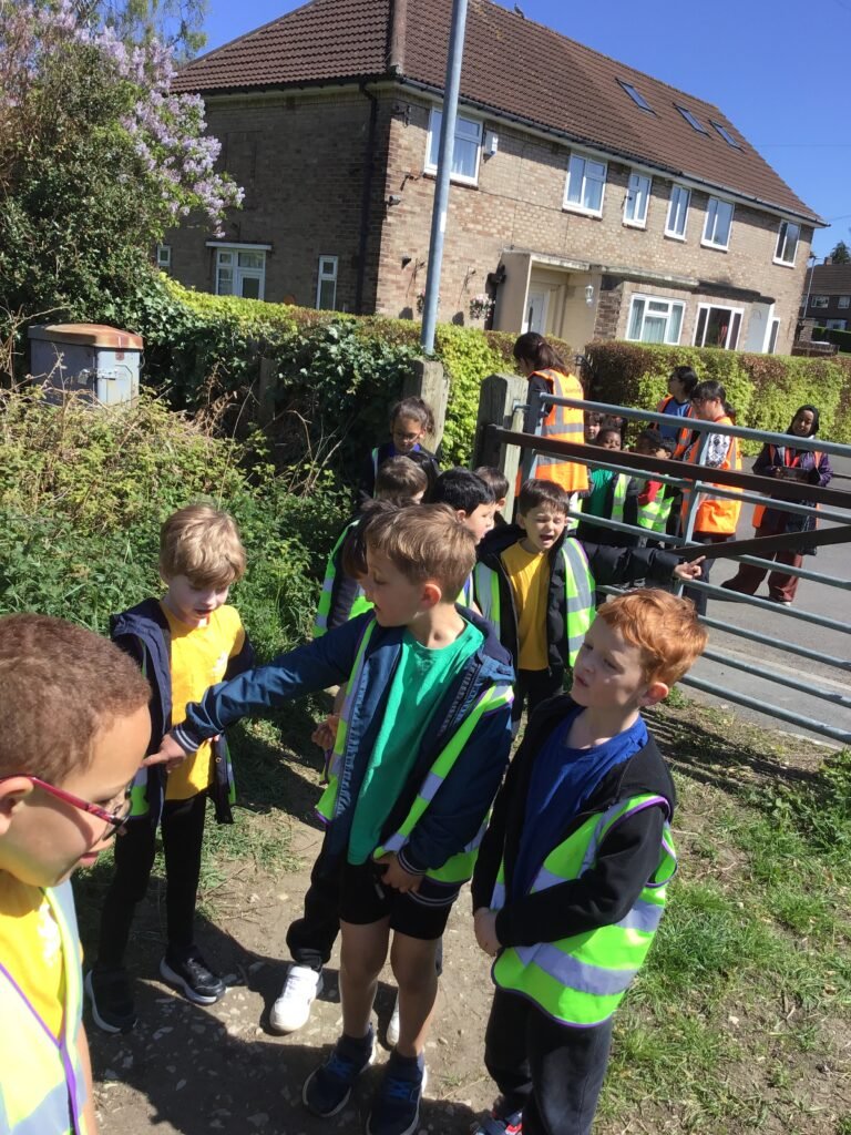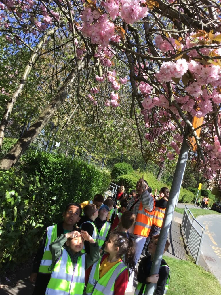 We saw many human features at the beginning of the walk, such as the pavement, litter bins, lamp posts. But we also enjoyed seeing the green hedges and stood under a tree full of pink blossom.